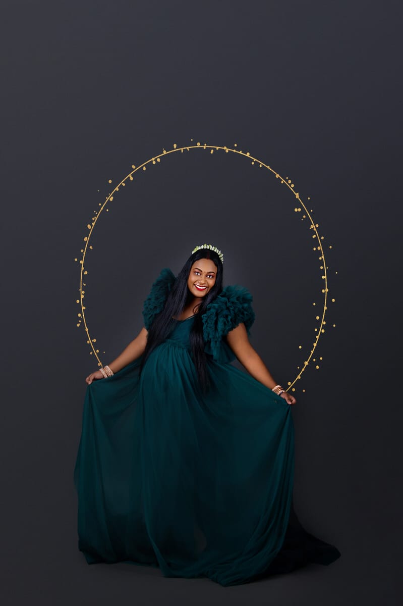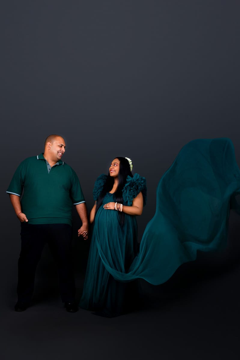 The studio lighting highlighted the soft shimmer of the fabric and her natural pregnancy glow — a stunning reminder that maternity portraits can be both timeless and deeply personal.