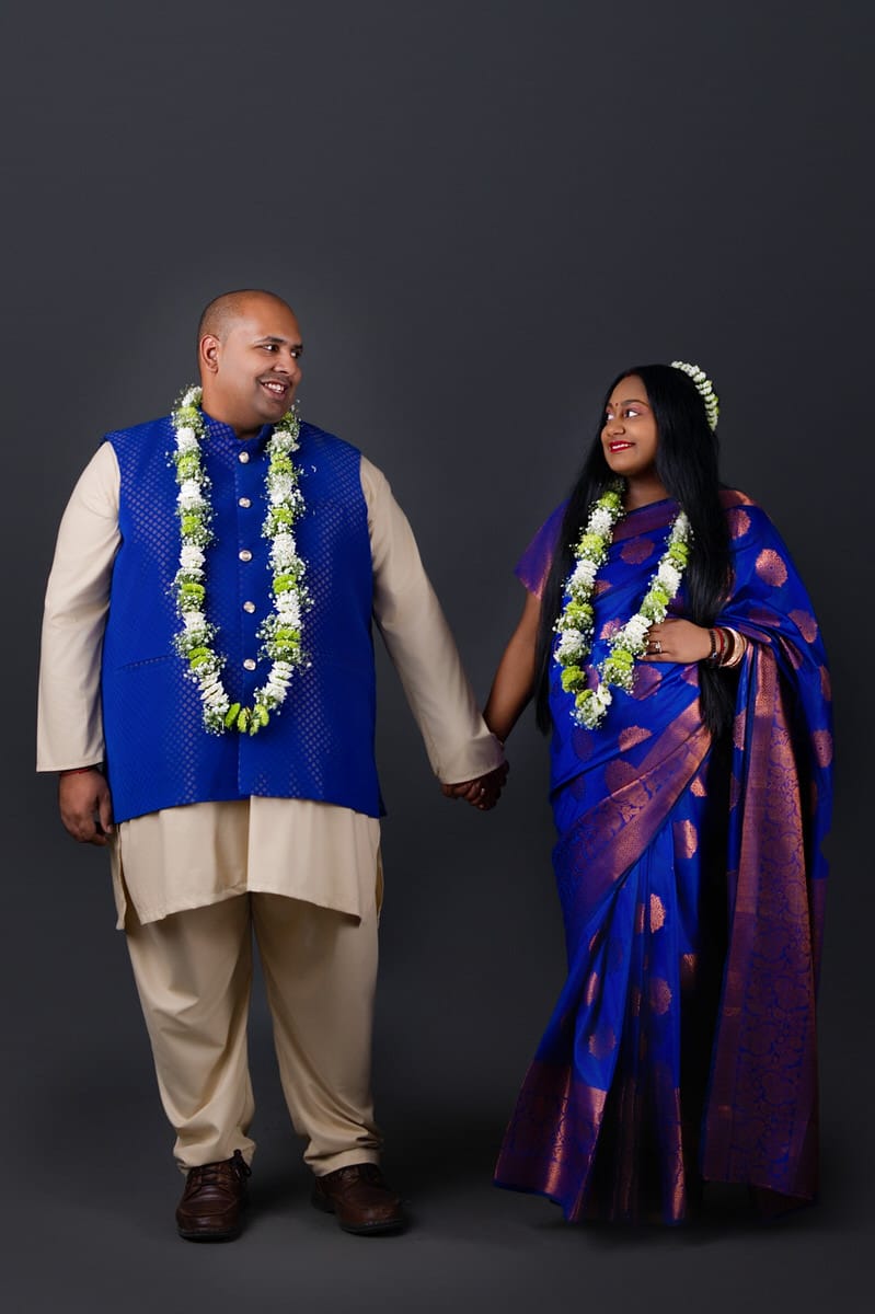 We focused on elegant studio poses that highlighted the beauty of Nicole’s sari — the delicate folds, the glowing fabric, and the love between the couple.