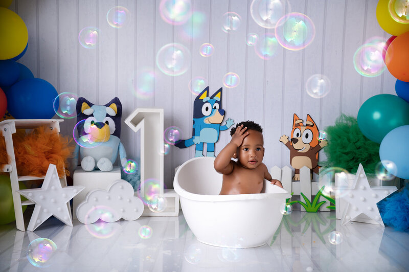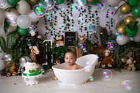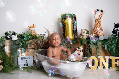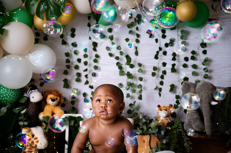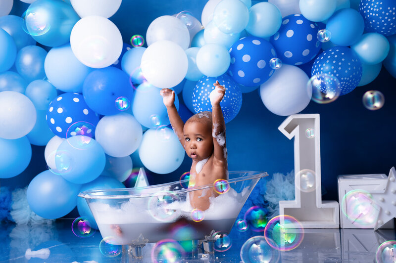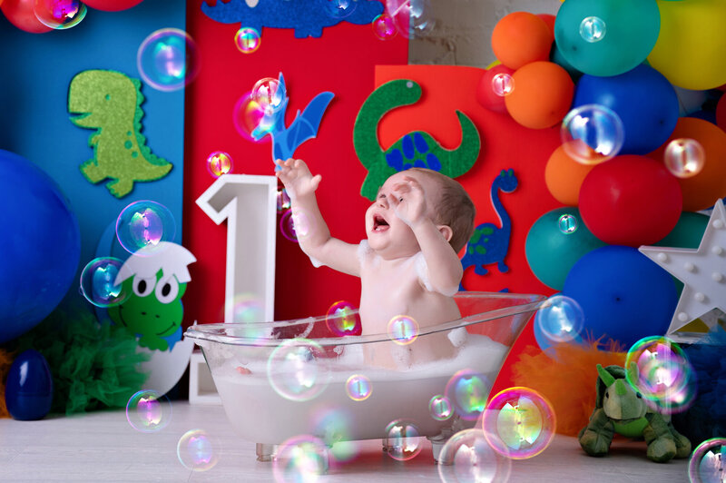 A fully styled cake smash setup, your chosen theme, a delicious cake, a clean portrait, the smash itself, and a bubbly warm bath to finish.