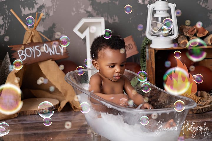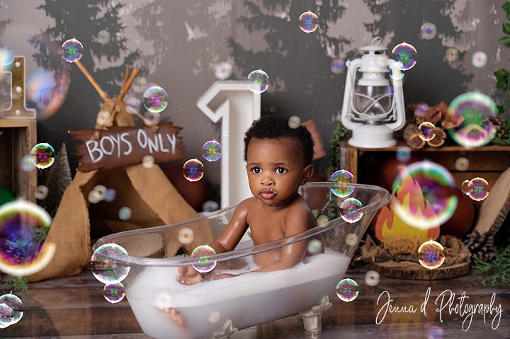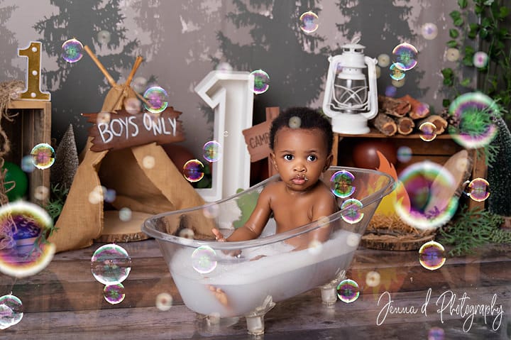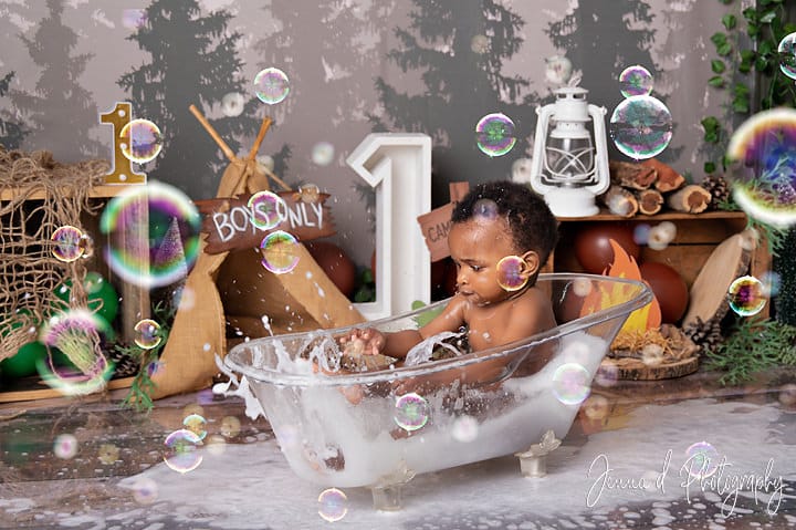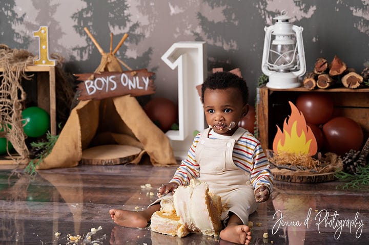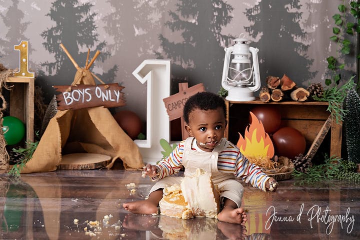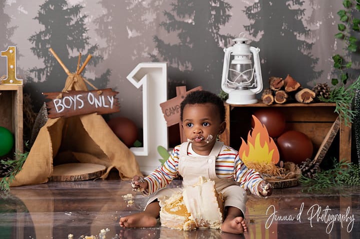 One of the greatest joys of being a photographer is seeing families return as their stories unfold. Just a year ago, I had the honor of photographing Venessa during her maternity session. She was glowing with anticipation, awaiting the arrival of her first child. Fast-forward to today, and baby Lumkile is celebrating his very first birthday with a one-of-a-kind camping-themed cake smash photoshoot in my Pretoria studio.